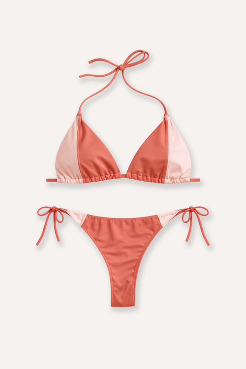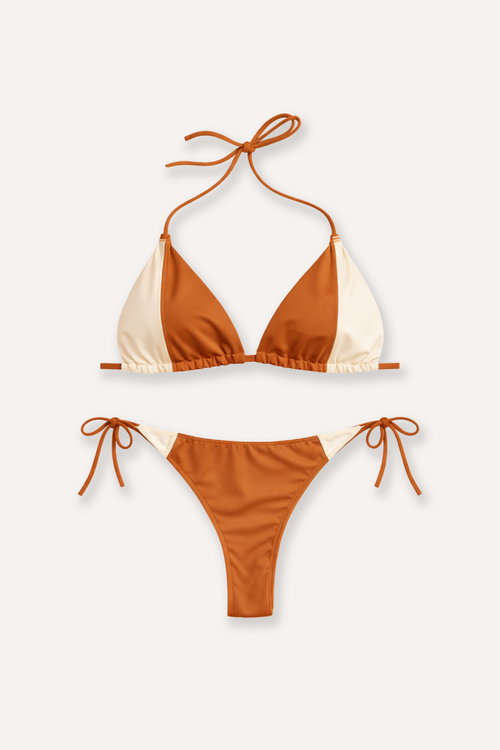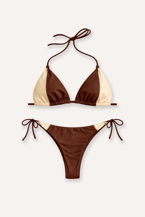 Bikini de triángulo en tejido texturizado con efecto orgánico, inspirado en las formas naturales de la arena y el movimiento del agua. El top presenta copas móviles y lazadas finas al cuello y la espalda que permiten ajustar la prenda con delicadeza, adaptándose al cuerpo de forma natural.